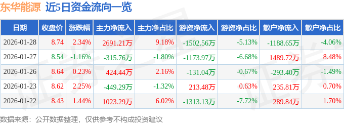 证券之星消息,截至2026年1月28日收盘,东华能源(002221)报收于8.74元,上涨2.34%,换手率2.29%,成交量33.48万手,成交额2.93亿元。