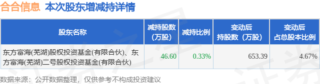 证券之星消息,1月28日合合信息发布公告《合合信息:上海合合信息科技股份有限公司关于持股5%以上股东减持时间届满暨减持结果公告》,其股东东方富海(芜湖)股权投资基金(有限合伙)、东方富海(芜湖)二号股权投资基金(有限合伙)于2026年1月7日至2026年1月27日间合计减持46.6万股,占公司目前总股本的0.3329%,变动期间该股股价上涨22.41%,截止1月27日收盘报301.88元。