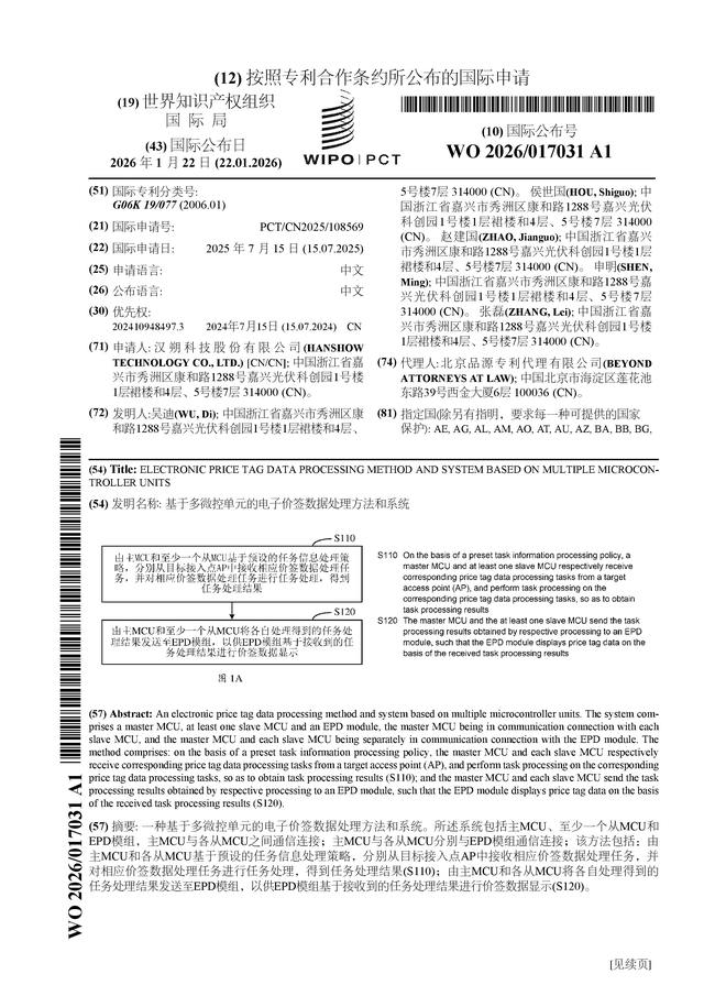 证券之星消息,根据企查查数据显示汉朔科技(301275)公布了一项国际专利申请,专利名为“基于多微控单元的电子价签数据处理方法和系统”,专利申请号为PCT/CN2025/108569,国际公布日为2026年1月22日。