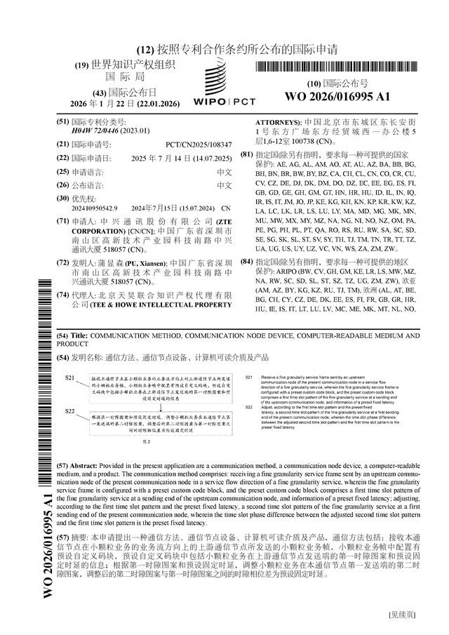 证券之星消息,根据企查查数据显示中兴通讯(000063)公布了一项国际专利申请,专利名为“通信方法、通信节点设备、计算机可读介质及产品”,专利申请号为PCT/CN2025/108347,国际公布日为2026年1月22日。