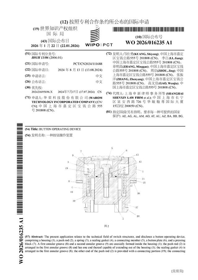 证券之星消息,根据企查查数据显示华荣股份(603855)公布了一项国际专利申请,专利名为“一种按钮操作装置”,专利申请号为PCT/CN2024/111688,国际公布日为2026年1月22日。