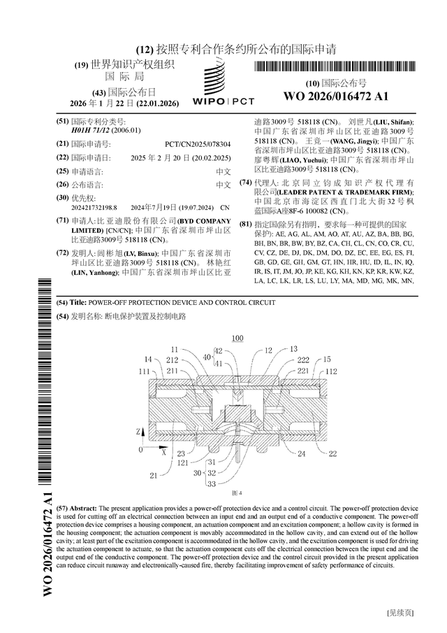 证券之星消息,根据企查查数据显示比亚迪(002594)公布了一项国际专利申请,专利名为“断电保护装置及控制电路”,专利申请号为PCT/CN2025/078304,国际公布日为2026年1月22日。