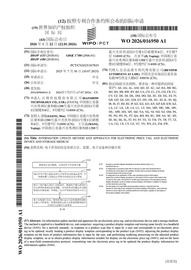 证券之星消息,根据企查查数据显示汉朔科技(301275)公布了一项国际专利申请,专利名为“电子价签的信息更新方法、装置、电子设备和存储介质”,专利申请号为PCT/CN2025/107819,国际公布日为2026年1月22日。