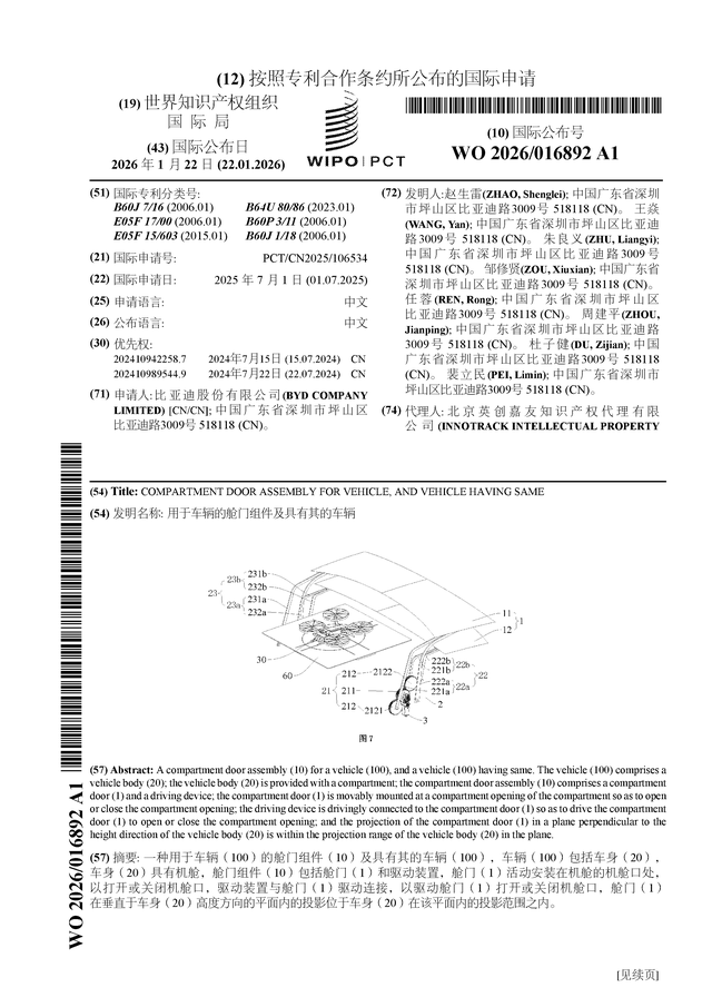 证券之星消息,根据企查查数据显示比亚迪(002594)公布了一项国际专利申请,专利名为“用于车辆的舱门组件及具有其的车辆”,专利申请号为PCT/CN2025/106534,国际公布日为2026年1月22日。