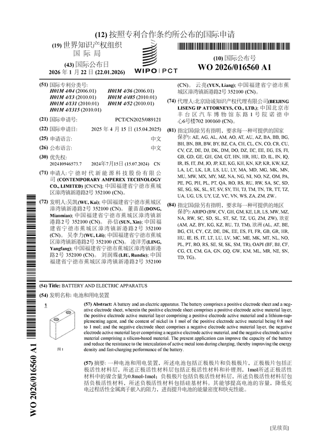 证券之星消息,根据企查查数据显示宁德时代(300750)公布了一项国际专利申请,专利名为“电池和用电装置”,专利申请号为PCT/CN2025/089121,国际公布日为2026年1月22日。