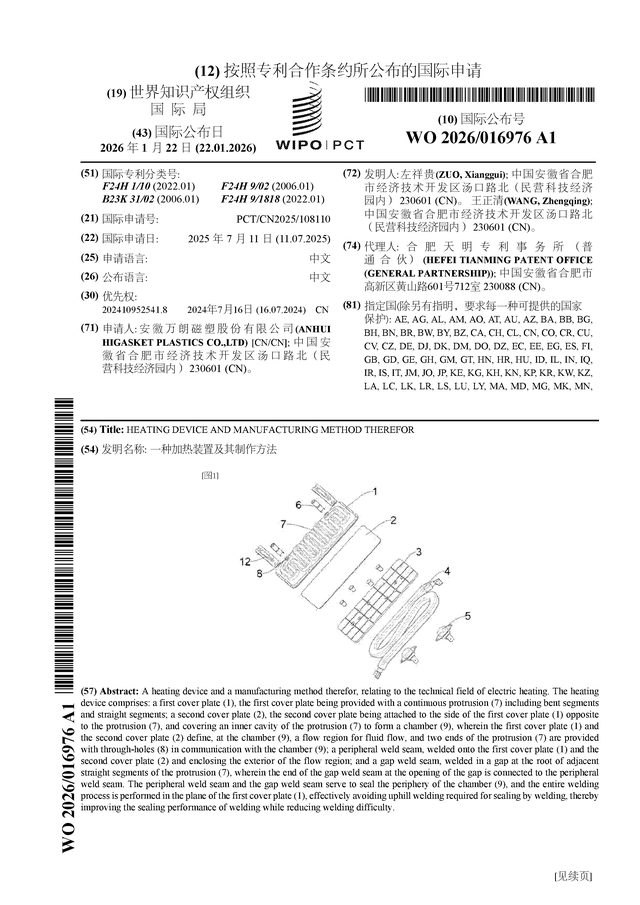 证券之星消息,根据企查查数据显示万朗磁塑(603150)公布了一项国际专利申请,专利名为“一种加热装置及其制作方法”,专利申请号为PCT/CN2025/108110,国际公布日为2026年1月22日。