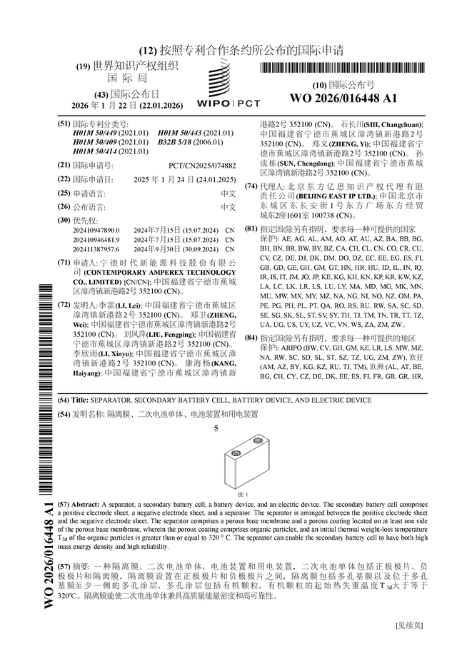 证券之星消息,根据企查查数据显示宁德时代(300750)公布了一项国际专利申请,专利名为“隔离膜、二次电池单体、电池装置和用电装置”,专利申请号为PCT/CN2025/074882,国际公布日为2026年1月22日。