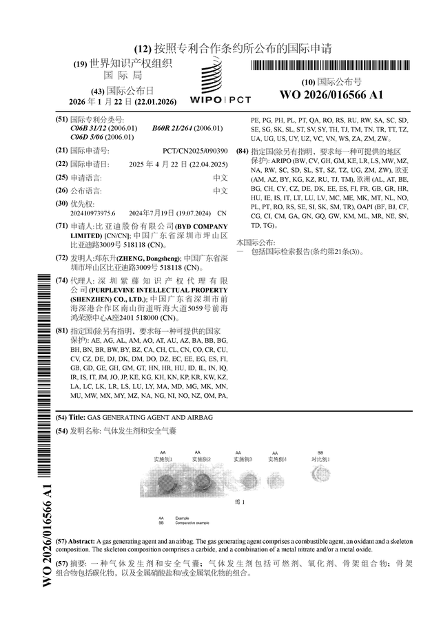 证券之星消息,根据企查查数据显示比亚迪(002594)公布了一项国际专利申请,专利名为“气体发生剂和安全气囊”,专利申请号为PCT/CN2025/090390,国际公布日为2026年1月22日。