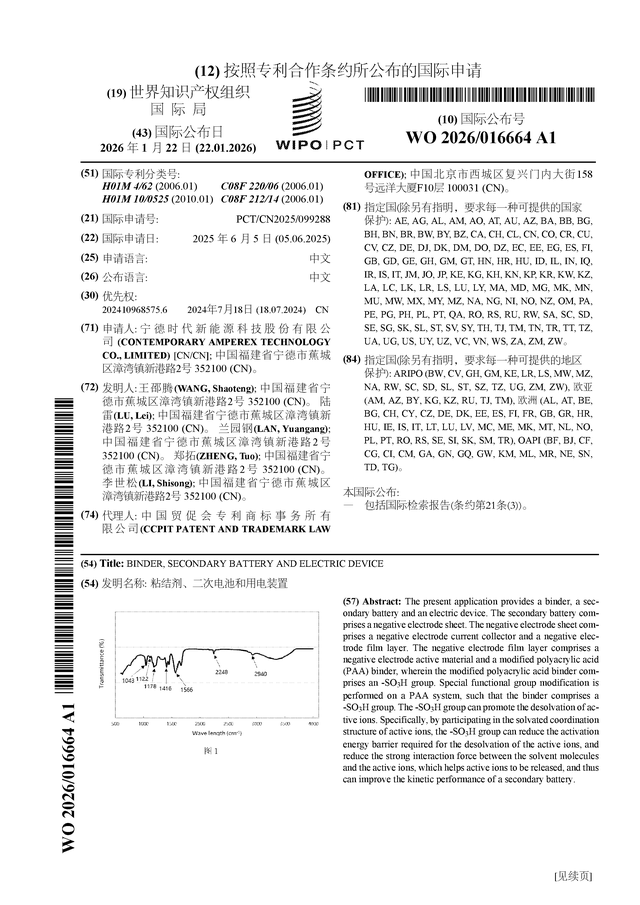 证券之星消息,根据企查查数据显示宁德时代(300750)公布了一项国际专利申请,专利名为“粘结剂、二次电池和用电装置”,专利申请号为PCT/CN2025/099288,国际公布日为2026年1月22日。