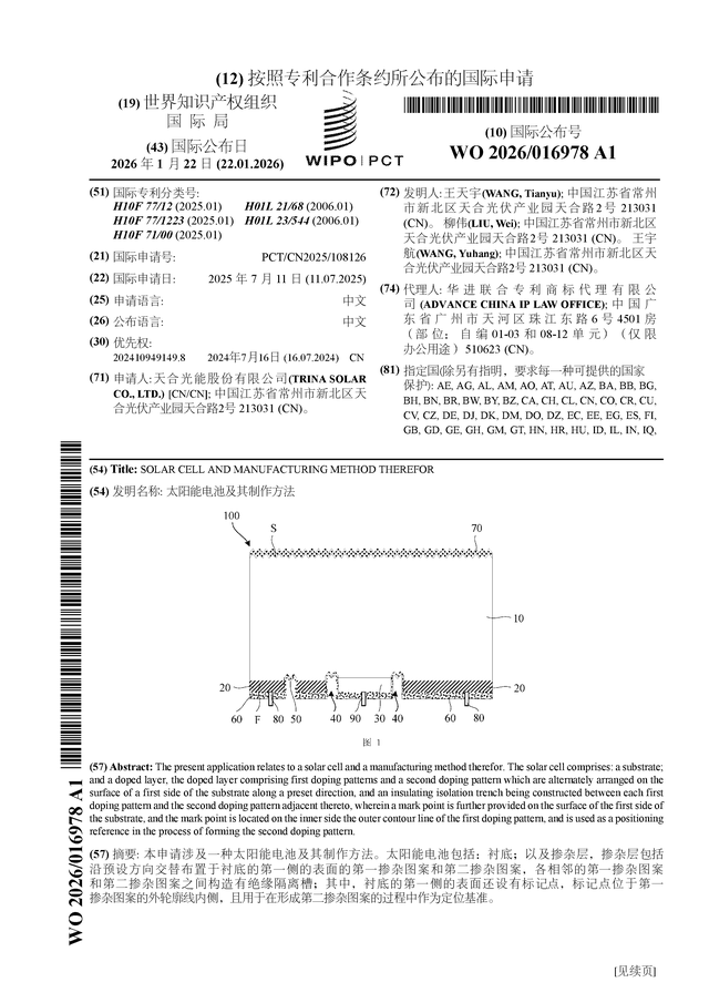 证券之星消息,根据企查查数据显示天合光能(688599)公布了一项国际专利申请,专利名为“太阳能电池及其制作方法”,专利申请号为PCT/CN2025/108126,国际公布日为2026年1月22日。