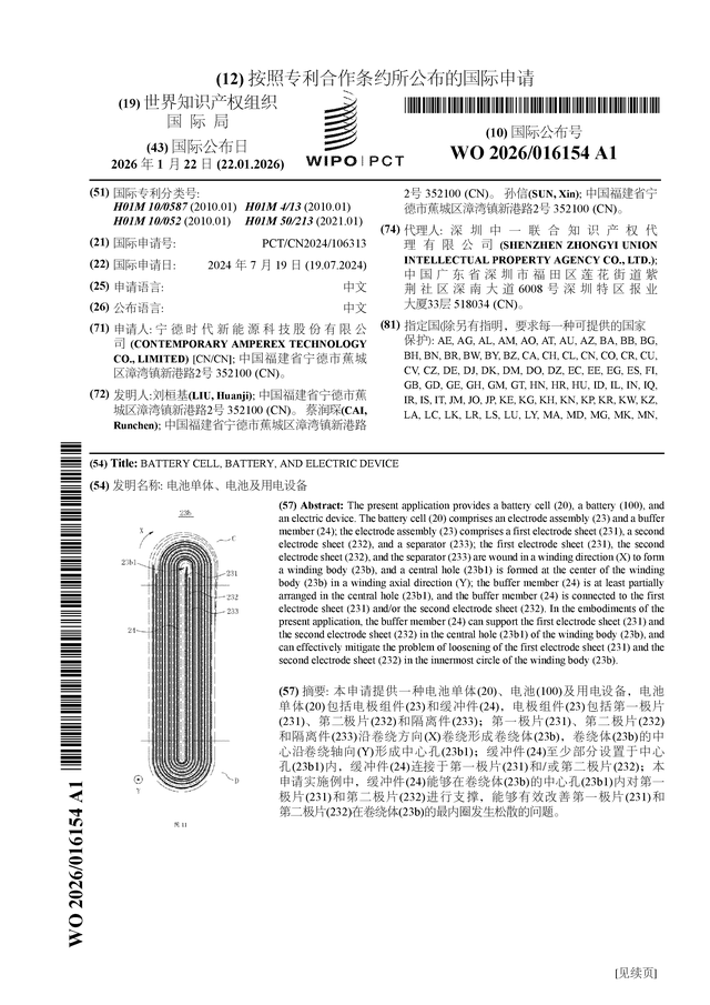 证券之星消息,根据企查查数据显示宁德时代(300750)公布了一项国际专利申请,专利名为“电池单体、电池及用电设备”,专利申请号为PCT/CN2024/106313,国际公布日为2026年1月22日。