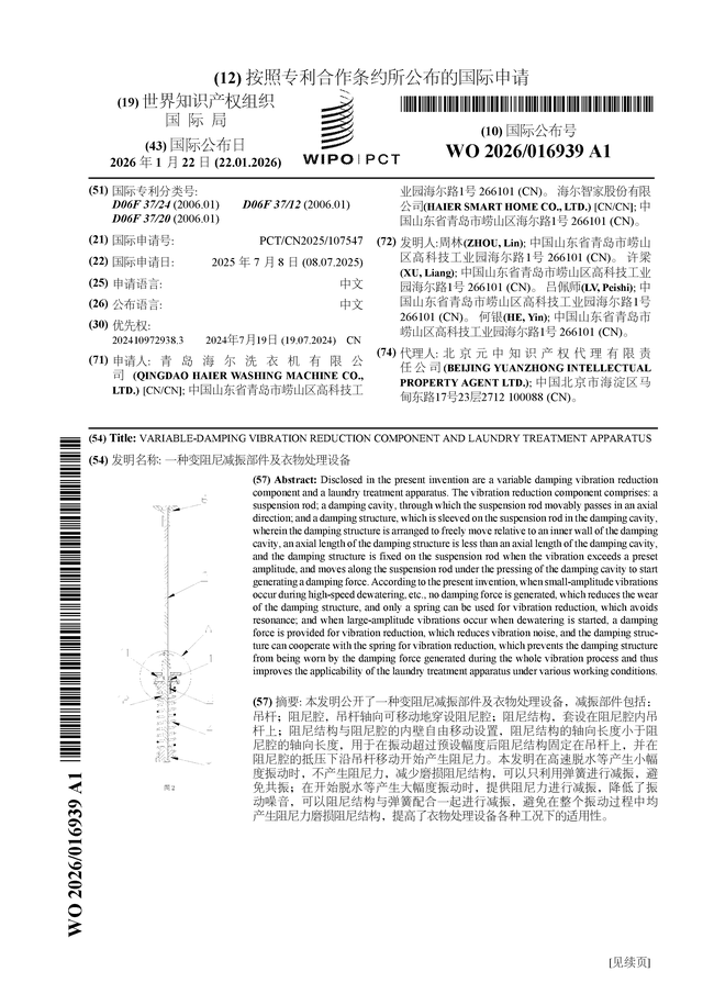 证券之星消息,根据企查查数据显示海尔智家(600690)公布了一项国际专利申请,专利名为“一种变阻尼减振部件及衣物处理设备”,专利申请号为PCT/CN2025/107547,国际公布日为2026年1月22日。