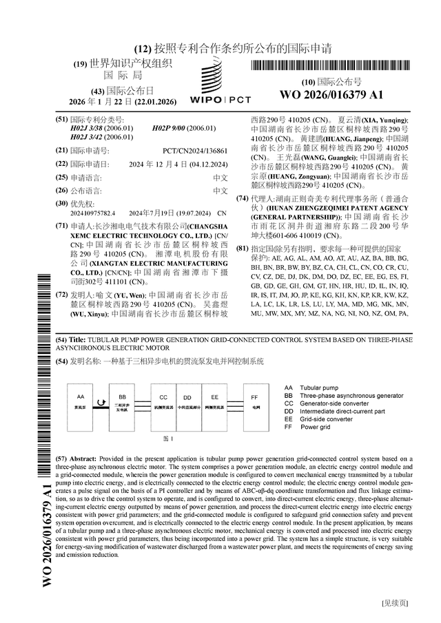 证券之星消息,根据企查查数据显示湘电股份(600416)公布了一项国际专利申请,专利名为“一种基于三相异步电机的贯流泵发电并网控制系统”,专利申请号为PCT/CN2024/136861,国际公布日为2026年1月22日。