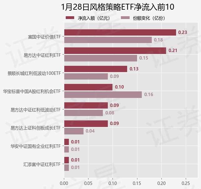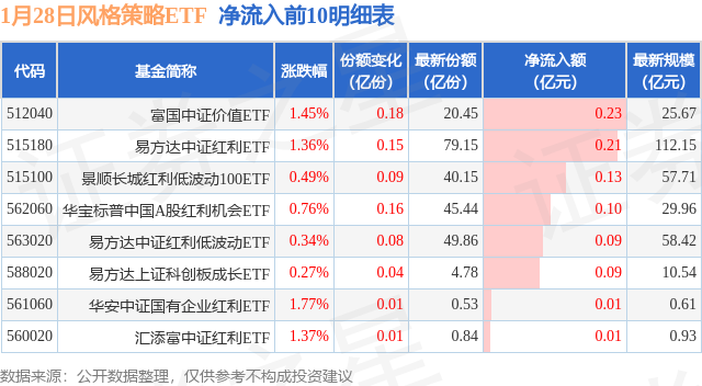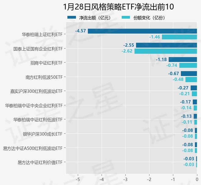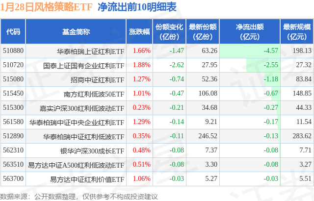 当日有20只风格策略ETF基金出现资金净流出,其中净流出排首位的是华泰柏瑞上证红利ETF(510880),份额减少了1.47亿份,净流出额为4.57亿元。