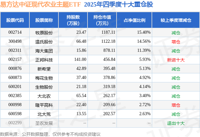 易方达中证现代农业主题ETF基金成立于2021年12月2日,基金经理为聂启文,基金跟踪标的为中证现代农业主题指数,成立以来超额回报为0.93%,近一个月超额回报为-0.03%。最新披露的基金持仓数据显示,截止2025年12月31日,该基金第一大重仓股为牧原股份(002714),持股占比为15.4%。