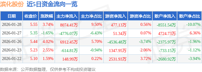 证券之星消息,截至2026年1月28日收盘,滨化股份(601678)报收于5.55元,上涨3.74%,换手率7.5%,成交量153.31万手,成交额8.5亿元。