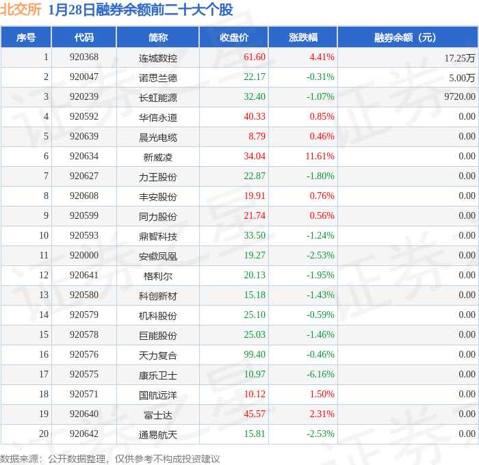 北交所融券余额前三分别为:连城数控(920368)融券余额17.25万元、诺思兰德(920047)融券余额5万元、长虹能源(920239)融券余额9720元,前20具体见下表: