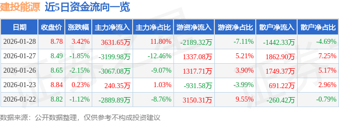 证券之星消息,截至2026年1月28日收盘,建投能源(000600)报收于8.78元,上涨3.42%,换手率3.26%,成交量35.55万手,成交额3.08亿元。
