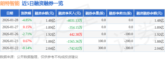 证券之星消息,截至2026年1月28日收盘,朗特智能(300916)报收于32.17元,下跌4.85%,换手率6.27%,成交量5.85万手,成交额1.91亿元。