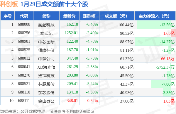 当日科创板成交额前10大个股中1只个股收涨,平均涨幅0.52%,其中澜起科技(688008)以成交额100.44亿元排第一。从主力资金流入看,成交额前10大个股中有3只个股呈现主力资金净流入。