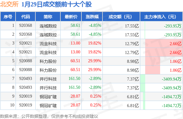 当日北交所成交额前10大个股中6只个股收涨,平均涨幅16.69%,其中连城数控(920368)以成交额17.55亿元排第一。从主力资金流入看,成交额前10大个股中有4只个股呈现主力资金净流入。