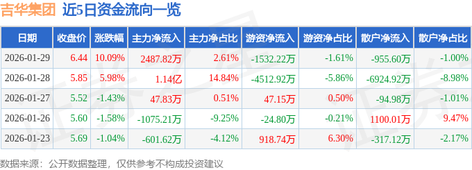 证券之星消息,吉华集团1月29日涨停收盘,收盘价6.44元。该股于14点43分涨停,1次打开涨停,截止收盘封单资金为942.93万元,占其流通市值0.22%。
