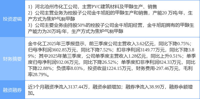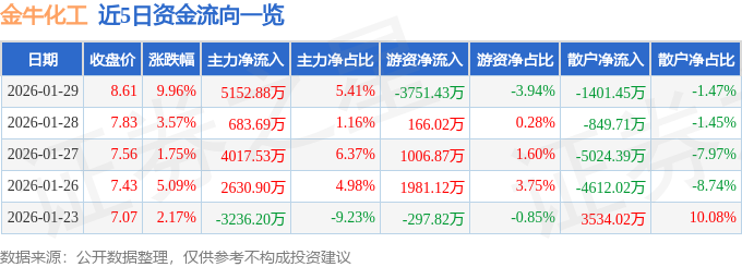 证券之星消息,金牛化工1月29日涨停收盘,收盘价8.61元。该股于14点38分涨停,3次打开涨停,截止收盘封单资金为294.11万元,占其流通市值0.05%。