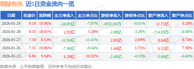 证券之星消息,铜陵有色1月29日涨停收盘,收盘价9.19元。该股于13点1分涨停,1次打开涨停,截止收盘封单资金为3.41亿元,占其流通市值0.33%。