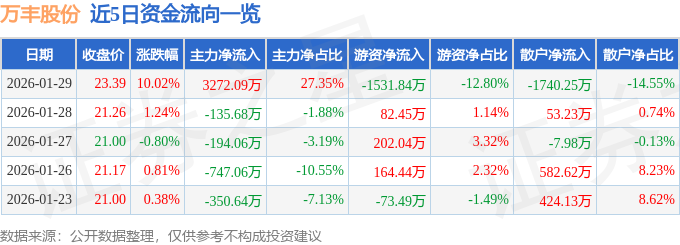 证券之星消息,万丰股份1月29日涨停收盘,收盘价23.39元。该股于10点6分涨停,1次打开涨停,截止收盘封单资金为9397.2万元,占其流通市值8.02%。
