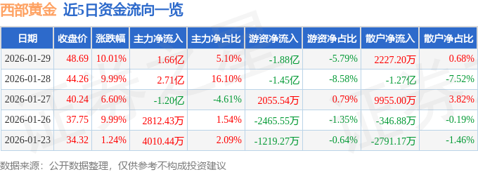 证券之星消息,西部黄金1月29日涨停收盘,收盘价48.69元。该股于9点25分涨停,4次打开涨停,截止收盘封单资金为1.47亿元,占其流通市值0.34%。