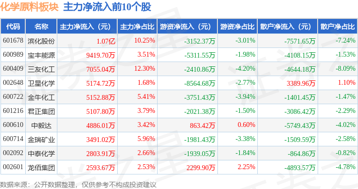 从资金流向上来看,当日化学原料板块主力资金净流出2.67亿元,游资资金净流出1.72亿元,散户资金净流入4.39亿元。化学原料板块个股资金流向见下表: