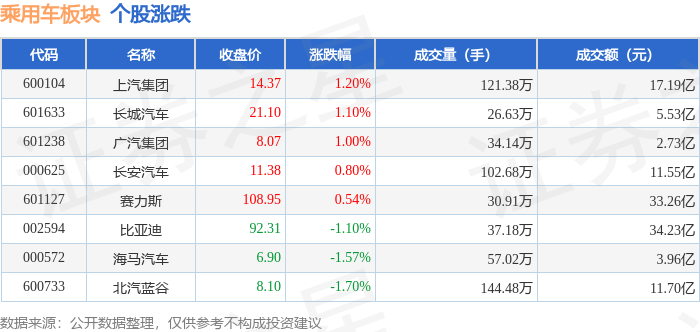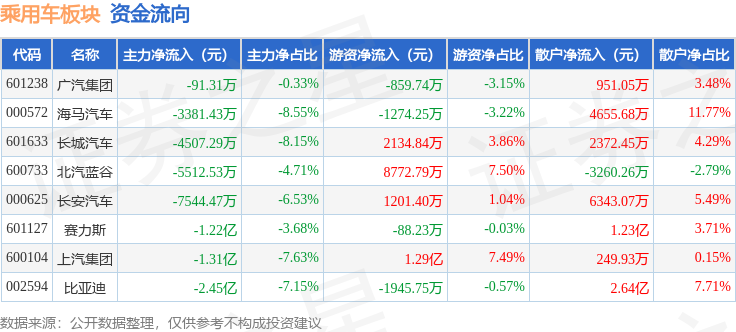 从资金流向上来看,当日乘用车板块主力资金净流出7.09亿元,游资资金净流入2.08亿元,散户资金净流入5.01亿元。乘用车板块个股资金流向见下表: