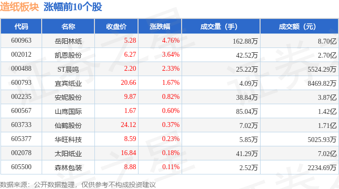 从资金流向上来看,当日造纸板块主力资金净流出1.08亿元,游资资金净流出694.91万元,散户资金净流入1.15亿元。造纸板块个股资金流向见下表: