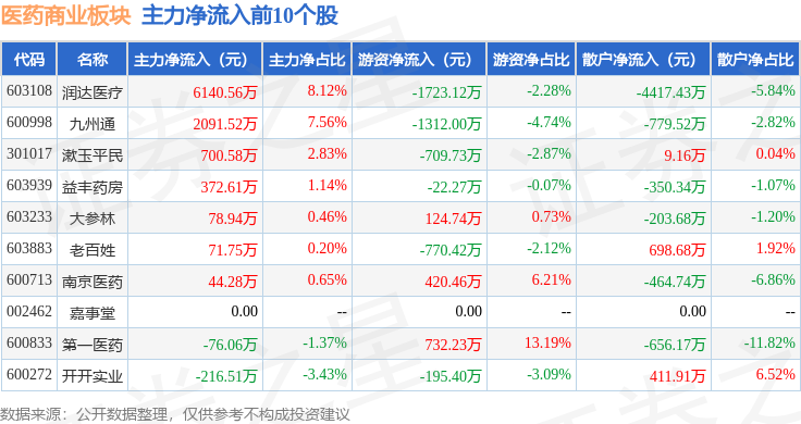 从资金流向上来看,当日医药商业板块主力资金净流出3.1亿元,游资资金净流出7797.89万元,散户资金净流入3.88亿元。医药商业板块个股资金流向见下表: