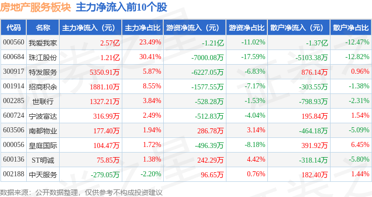 从资金流向上来看,当日房地产服务板块主力资金净流入4.61亿元,游资资金净流出2.82亿元,散户资金净流出1.79亿元。房地产服务板块个股资金流向见下表: