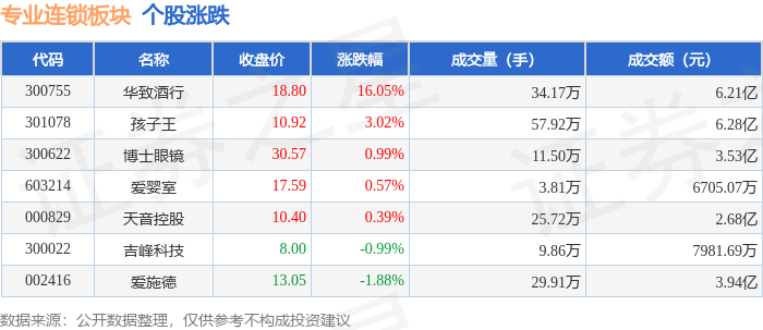 证券之星消息,1月29日专业连锁板块较上一交易日上涨2.14%,华致酒行领涨。当日上证指数报收于4157.98,上涨0.16%。深证成指报收于14300.08,下跌0.3%。专业连锁板块个股涨跌见下表:
