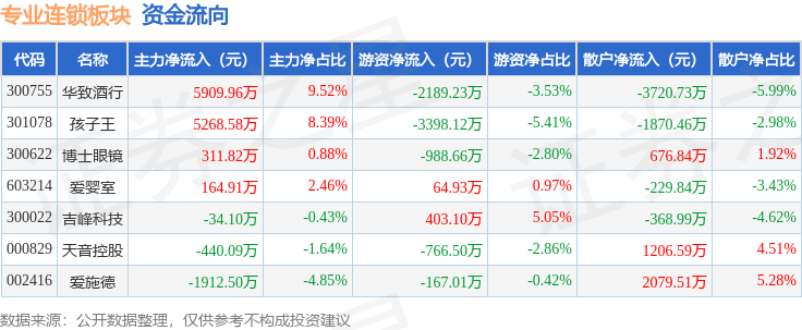 从资金流向上来看,当日专业连锁板块主力资金净流入9268.57万元,游资资金净流出7041.5万元,散户资金净流出2227.07万元。专业连锁板块个股资金流向见下表: