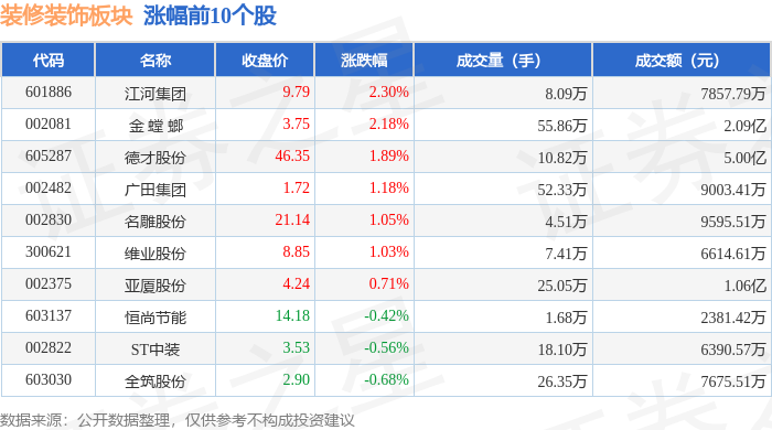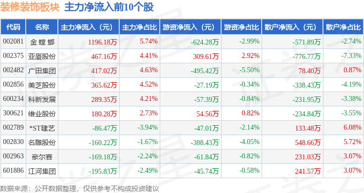 从资金流向上来看,当日装修装饰板块主力资金净流出1.36亿元,游资资金净流入285.72万元,散户资金净流入1.34亿元。装修装饰板块个股资金流向见下表: