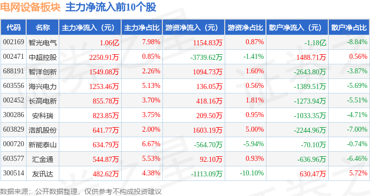 从资金流向上来看,当日电网设备板块主力资金净流出51.22亿元,游资资金净流入8.17亿元,散户资金净流入43.05亿元。电网设备板块个股资金流向见下表:
