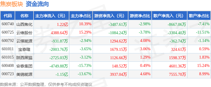 从资金流向上来看,当日焦炭板块主力资金净流出5359.97万元,游资资金净流入3614.13万元,散户资金净流入1745.84万元。焦炭板块个股资金流向见下表: