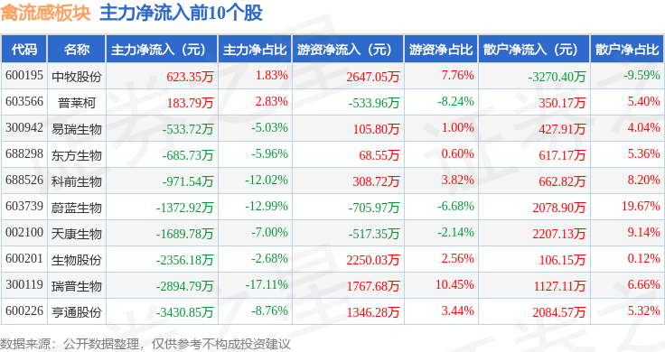 从资金流向上来看,当日禽流感板块主力资金净流出1.99亿元,游资资金净流入7452.05万元,散户资金净流入1.24亿元。禽流感板块个股资金流向见下表: