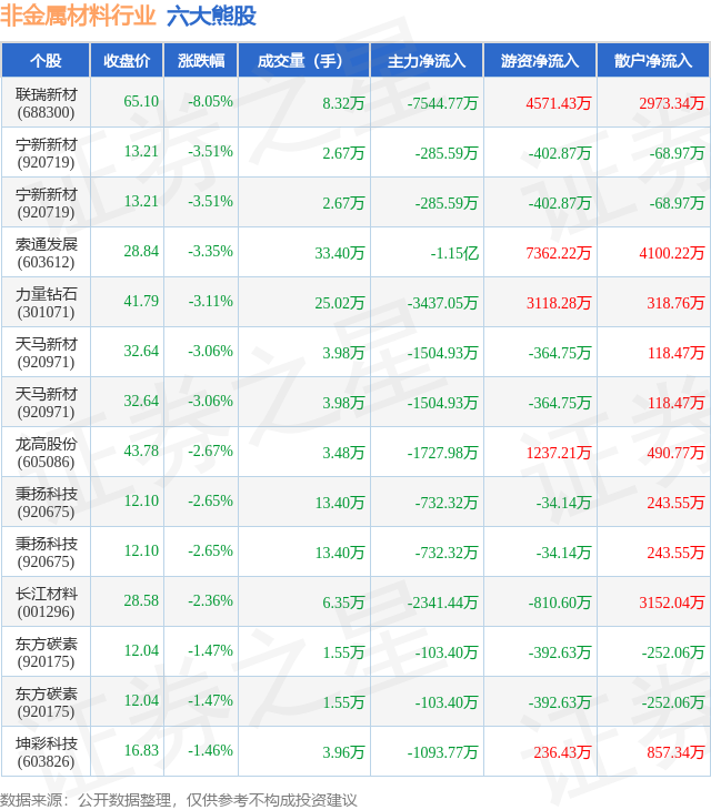 个股表现方面,非金属材料行业当日领跌股为联瑞新材(688300),该股当日报收65.1,下跌8.05%,成交量8.32万,主力资金净流出7544.77万元。宁新新材(920719)以下跌3.51%紧随其后,该股当日成交量2.67万,主力资金净流出285.59万元。除此之外,宁新新材(920719)、索通发展(603612)、力量钻石(301071)均进入当日熊股之列。具体个股列表见下表: