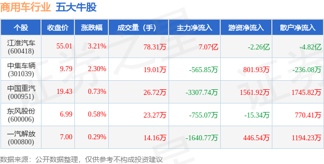 个股表现方面,商用车行业当日领涨股为江淮汽车(600418),该股当日报收55.01,上涨3.21%,成交量78.31万,主力资金净流入7.07亿元。中集车辆(301039)以上涨2.3%紧随其后,该股当日成交量19.01万,主力资金净流出565.85万元。除此之外,中国重汽(000951)、东风股份(600006)、一汽解放(000800)均进入当日牛股之列。具体个股列表见下表: