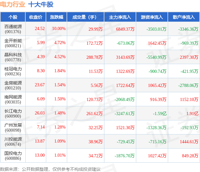 个股表现方面,电力行业当日领涨股为百通能源(001376),该股当日报收24.52,上涨10.0%,成交量29.99万,主力资金净流入6849.37万元。金开新能(600821)以上涨4.72%紧随其后,该股当日成交量172.72万,主力资金净流出673.06万元。除此之外,晶科科技(601778)、桂冠电力(600236)、金房能源(001210)均进入当日牛股之列。具体个股列表见下表: