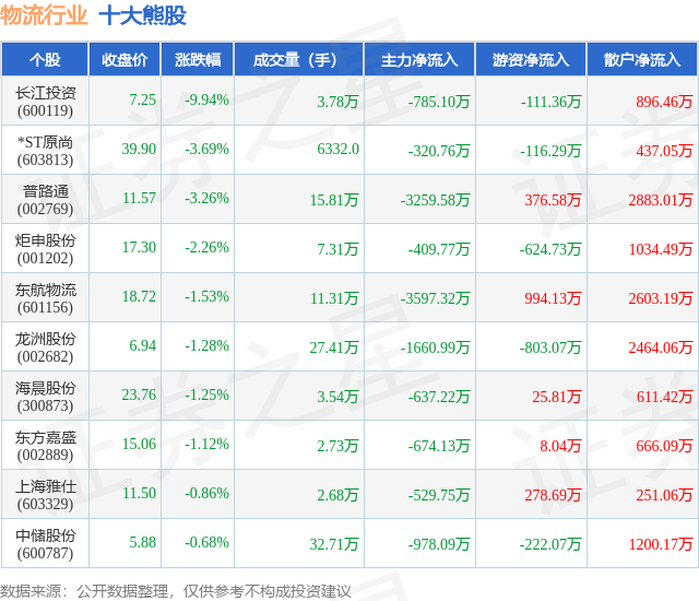 个股表现方面,物流行业当日领跌股为长江投资(600119),该股当日报收7.25,下跌9.94%,成交量3.78万,主力资金净流出785.1万元。*ST原尚(603813)以下跌3.69%紧随其后,该股当日成交量6332.0,主力资金净流出320.76万元。除此之外,普路通(002769)、炬申股份(001202)、东航物流(601156)均进入当日熊股之列。具体个股列表见下表: