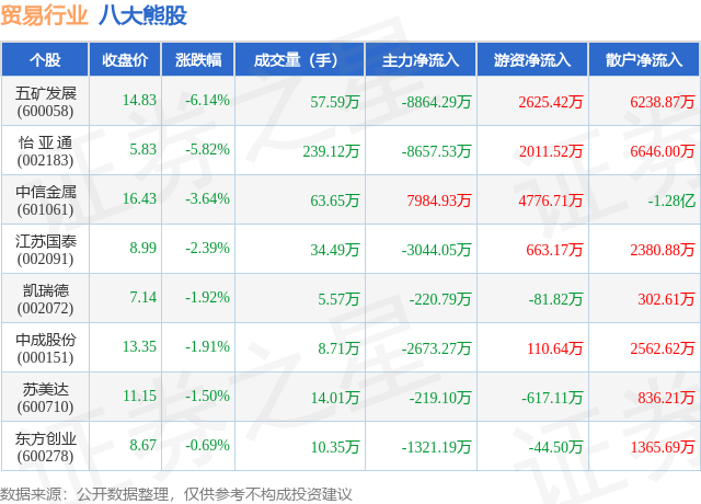 个股表现方面,贸易行业当日领跌股为五矿发展(600058),该股当日报收14.83,下跌6.14%,成交量57.59万,主力资金净流出8864.29万元。怡 亚 通(002183)以下跌5.82%紧随其后,该股当日成交量239.12万,主力资金净流出8657.53万元。除此之外,中信金属(601061)、江苏国泰(002091)、凯瑞德(002072)均进入当日熊股之列。具体个股列表见下表: