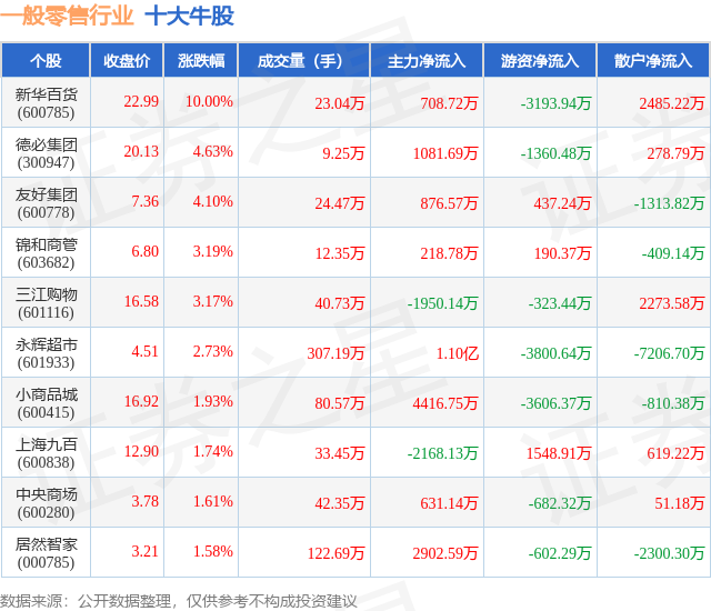 个股表现方面,一般零售行业当日领涨股为新华百货(600785),该股当日报收22.99,上涨10.0%,成交量23.04万,主力资金净流入708.72万元。德必集团(300947)以上涨4.63%紧随其后,该股当日成交量9.25万,主力资金净流入1081.69万元。除此之外,友好集团(600778)、锦和商管(603682)、三江购物(601116)均进入当日牛股之列。具体个股列表见下表: