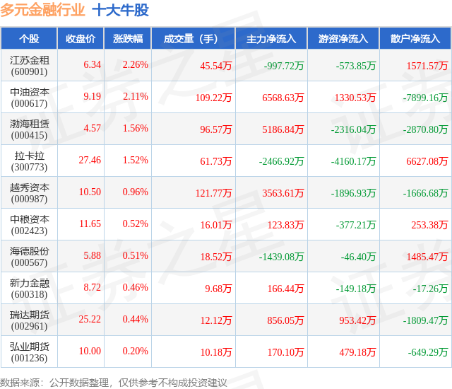 个股表现方面,多元金融行业当日领涨股为江苏金租(600901),该股当日报收6.34,上涨2.26%,成交量45.54万,主力资金净流出997.72万元。中油资本(000617)以上涨2.11%紧随其后,该股当日成交量109.22万,主力资金净流入6568.63万元。除此之外,渤海租赁(000415)、拉卡拉(300773)、越秀资本(000987)均进入当日牛股之列。具体个股列表见下表: