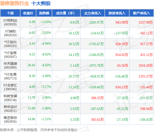 个股表现方面,装修装饰行业当日领跌股为ST柯利达(603828),该股当日报收6.99,下跌5.03%,成交量8.81万,主力资金净流出2201.97万元。ST瑞和(002620)以下跌5.02%紧随其后,该股当日成交量10.12万,主力资金净流出214.61万元。除此之外,*ST创兴(600193)、*ST宝鹰(002047)、中天精装(002989)均进入当日熊股之列。具体个股列表见下表: