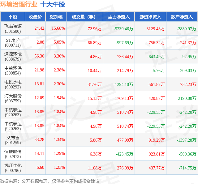 个股表现方面,环境治理行业当日领涨股为飞南资源(301500),该股当日报收24.42,上涨15.68%,成交量72.96万,主力资金净流出5239.46万元。ST京蓝(000711)以上涨5.05%紧随其后,该股当日成交量66.89万,主力资金净流出997.69万元。除此之外,通源环境(688679)、中兰环保(300854)、电投水电(600292)均进入当日牛股之列。具体个股列表见下表: